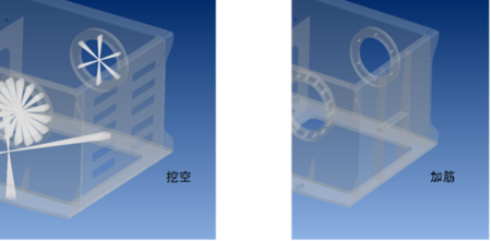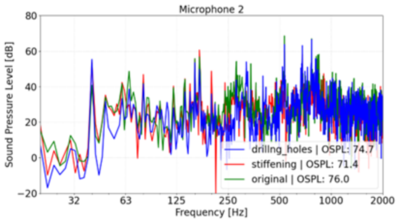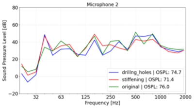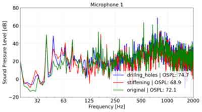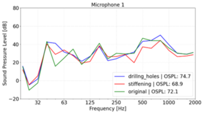 图5 侧板结构优化方案(左侧为挖空方案,右侧为纵向加筋方案) 通过仿真验算,纵向加筋的方案(下图红色曲线)相对初始设计方案(下图绿色曲线)在关键的两个麦克风测点的噪声分别降低了3.2dB和4.6dB;而挖空的方案(下图蓝色曲线)在麦克风1点会增大噪声,麦克风2点会降低噪声。