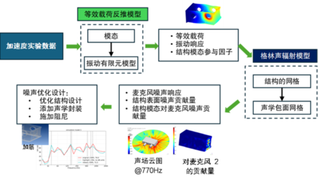二、基于振动测试结果反推结构载荷 这一期,我们将介绍第一种振动识别方法:基于振动测试结果反推结构载荷。其他识别方法将在后续的文章中加以介绍。 当我们遇到产品振动或辐射噪声超标,需要进行优化设计时,在载荷未知而只有结构有限元模型的情况下,很难定量的评估结构优化的效果。如果能够获得实际的载荷,并用于新的设计方案的仿真分析和验算,是非常有工程意义的。 自Actran 2023.2版本以来,新增了Equivalent BC analysis分析功能,旨在根据振动或噪声的测量值求解结构力或声源载荷强度。这种分析包括两个步骤,整合了Actran常规分析功能与载荷反推功能: (1)提取每一种载荷(contributor)对目标测点响应的传递函数。 (2)根据目标测点响应的输入值,利用反推算法基于上述传递函数计算等效载荷的幅值和相位信息。 因此,在使用这一种振动识别方法时,需要已知结构的有限元模型或模态,并能准确的定义结构在工作状态下的载荷形式(集中力/分布力/压力等),但载荷大小未知。通过结构振动表面的测试结果反推载荷强度。反推出的载荷可用于进一步的结构优化和噪声评估。 详细的流程如下: (1)获得实验测试的加速度数据。 (2)基于振动有限元模型定义(Equivalent BC)等效载荷反推模型,为每个结构载荷设定一个“假”的数值并添加至对应的contributor中。 (3)Actran将计算每一个contributor到加速度测点之间的传递函数,并结合实验测试数据计算每个贡献者的载荷强度,同时输出所有结构单元的振动响应及模态参与因子。 (4)基于结构网格创建声学包面网格,定义格林声辐射分析模型。此步骤考虑到后期要进行多种不同结构设计方案下噪声的评估,为了提高计算效率而定义格林分析。如果只是为了验证一两种结构的辐射噪声,则可以采用常规的声学直接频响分析建模。 (5)格林分析将输出麦克风测点的噪声响应,并一同输出结构表面各个单元对噪声的贡献量以及各个结构模态对噪声的贡献量。 (6)噪声优化:基于第五步的声场贡献量分析,对贡献较大的结构区域进行结构优化,使用反推出的结构载荷进行新结构设计下的振动和噪声验算,比如加筋优化或阻尼优化;也可以对辐射噪声较强的区域进行声学封装材料的设计,并使用格林分析模型进行噪声验算。